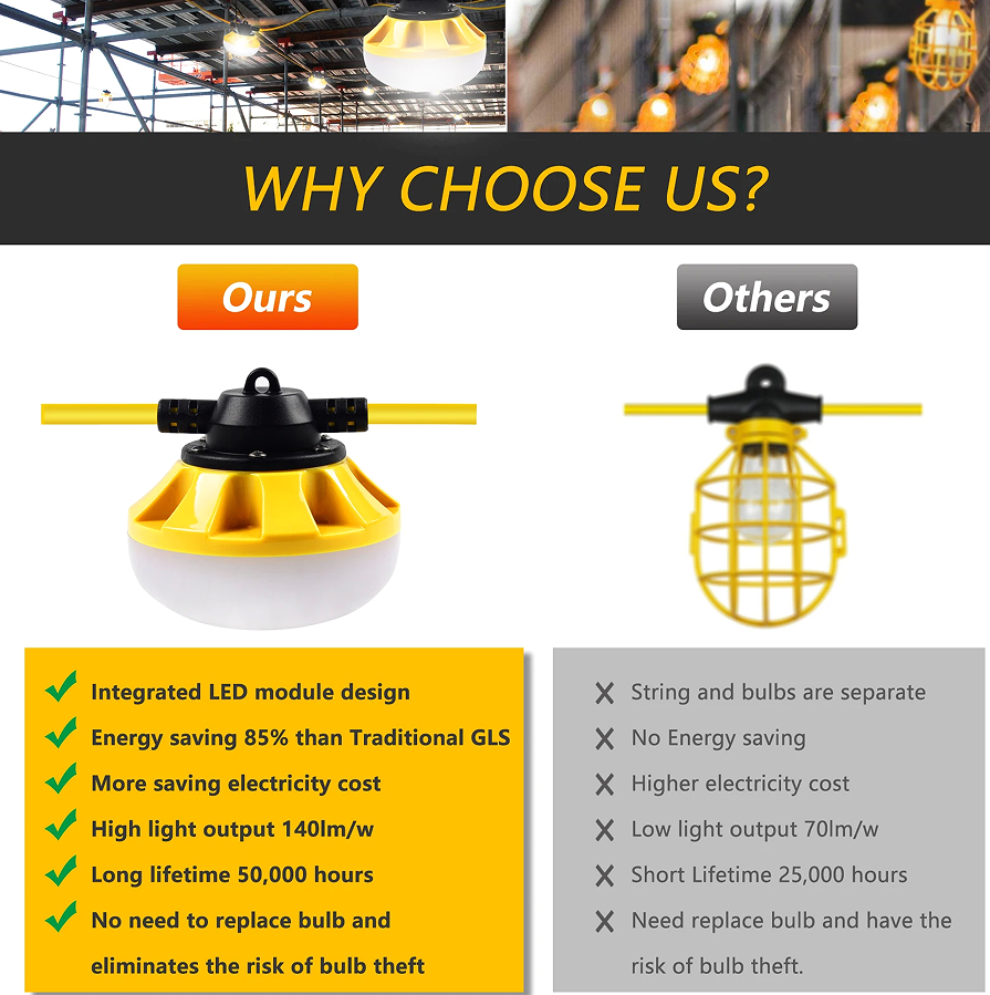 Our Led construction string light can be used as a temproary work site light stringer. great for Construction Site Lighting,Temporary Job-Site Lighting, Outdoor Lighting, Work Site Lighting, Emergency Lighting, Restoration Work Lighting. This Led work light string is easy installation, portable and multiple stringers can be end to end connectable.
