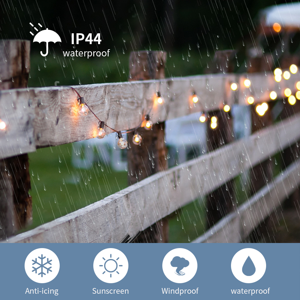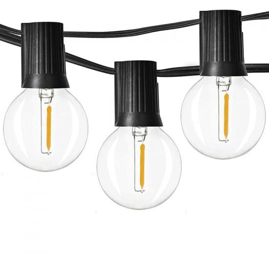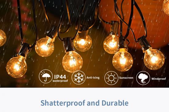 The waterproof and durable outdoor string light has a fully sealed and self-sealed socket, which can withstand extreme temperatures. Top quality G40 outdoor string lights can provide you with a bright with warm atmosphere and save energy and electricity bills.Durable LED light string, plastic bulbs are shatterproof and replaceable & E12 base. These bistro string lights support end to end connection up! It is with an easy installation cup hook, you can fix it or place it anywhere as you need.
