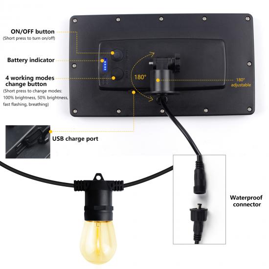 Our waterproof S14 solar string lights are with high quality 18650 lithium battery inside the panel. It can last 10-16hours lighting after full charged. Our solar panel string light is with polysilicon glass panel, better quality than commonly used PET panel. We used clear PC bulbs to ensure the solar string light bulbs are not as easy broken as glass during transportation or installation. Our solar led string light support 4 modes adjustable, 50% brightness, 100% brightness,breath and flashing. It will create your garden, bistro, camping tent or other outside area a warm and romantic ambiance.