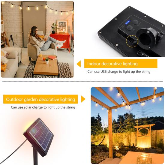 Our waterproof ST38 solar string lights are with high quality 18650 lithium battery inside the panel. It can last 10-16hours lighting after full charged. Our solar panel string light is with polysilicon glass panel, better quality than commonly used PET panel. We used clear PC bulbs to ensure the solar string light bulbs are not as easy broken as glass during transportation or installation. Our solar led string light support 4 modes adjustable, 50% brightness, 100% brightness,breath and flashing. It will create your garden, bistro, camping tent or other outside area a warm and romantic ambiance.